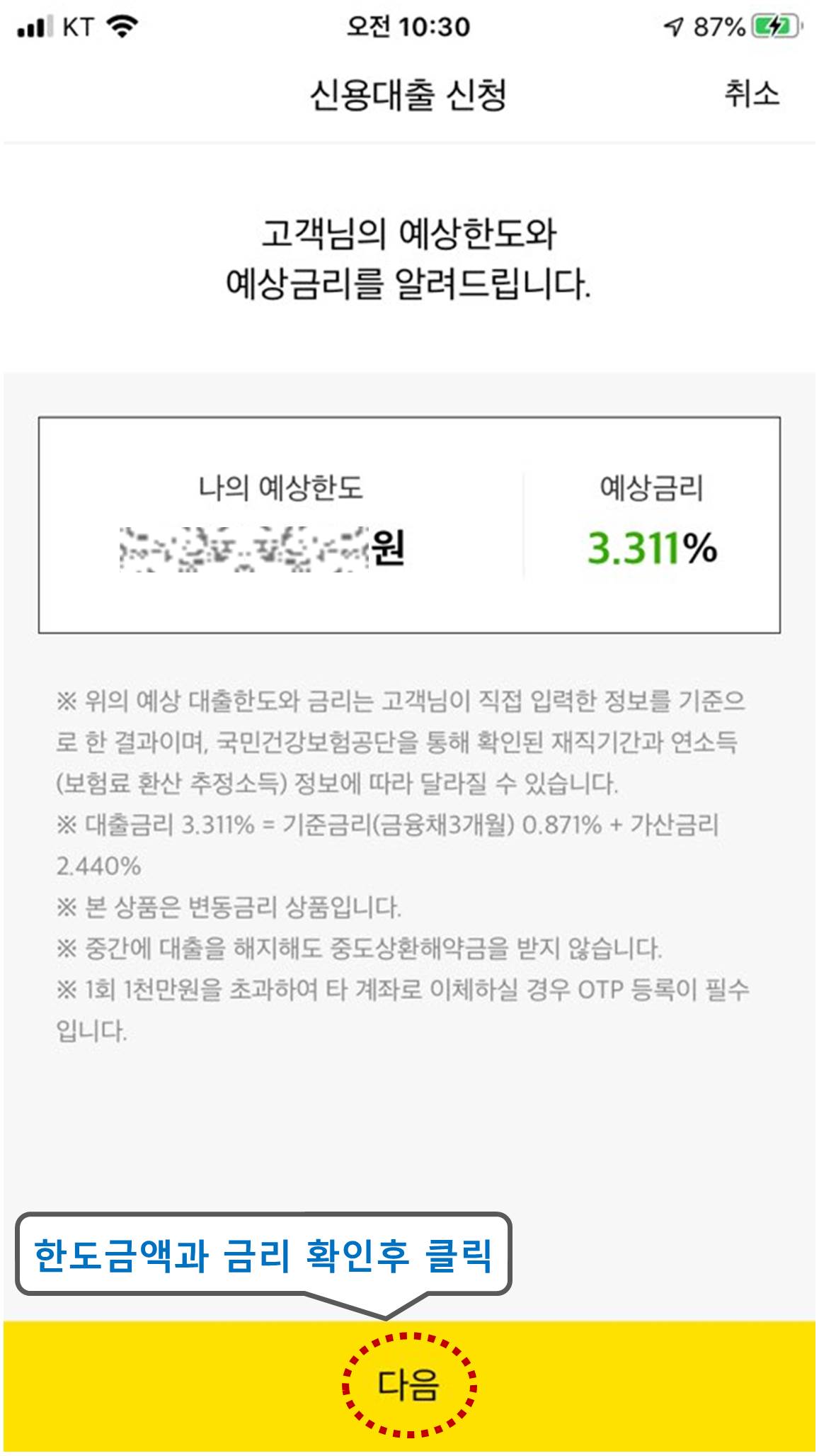 #9. 나의 예상한도 금액과 예상금리가 나옵니다. "다음"을 클릭하면(금리는 신용도에 따라서 차이가 있습니다.)
