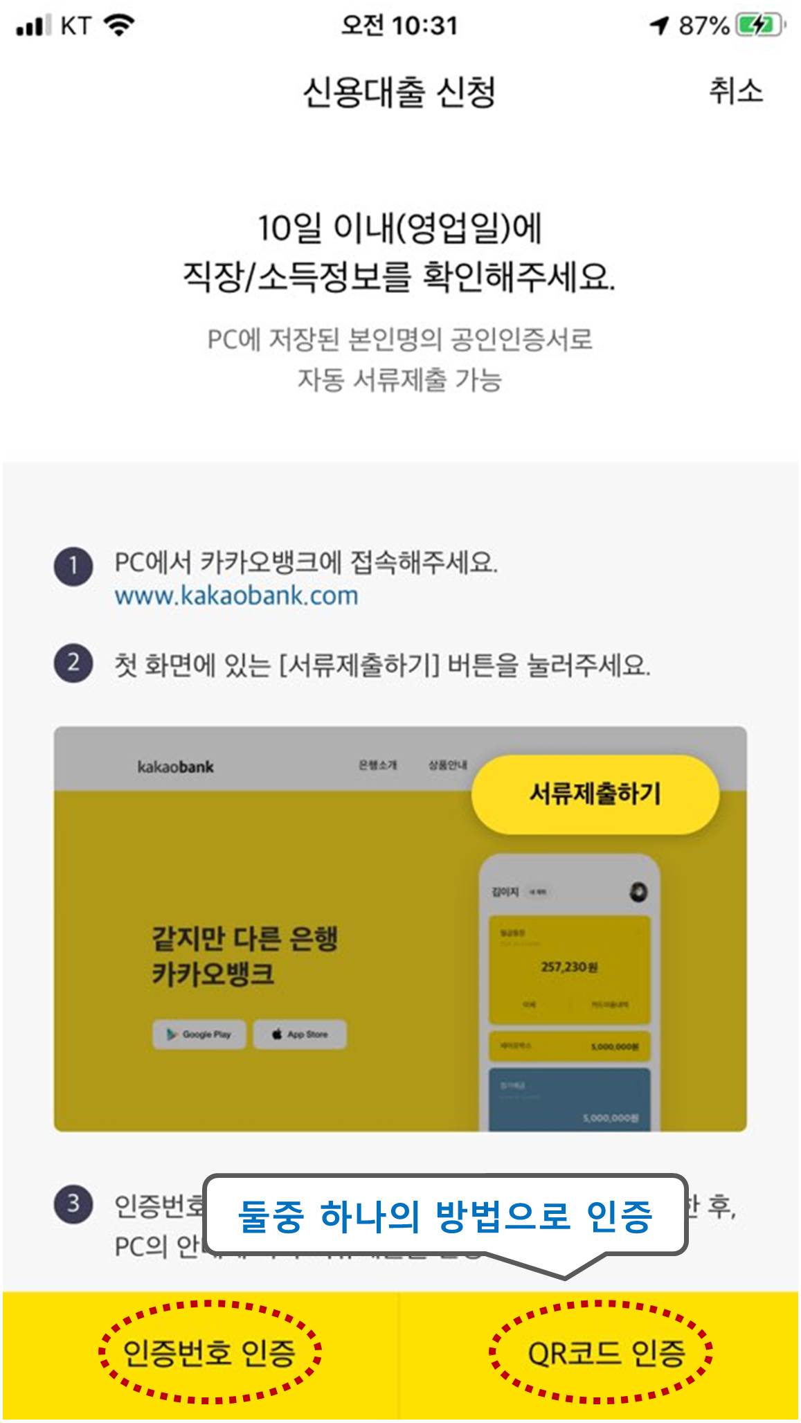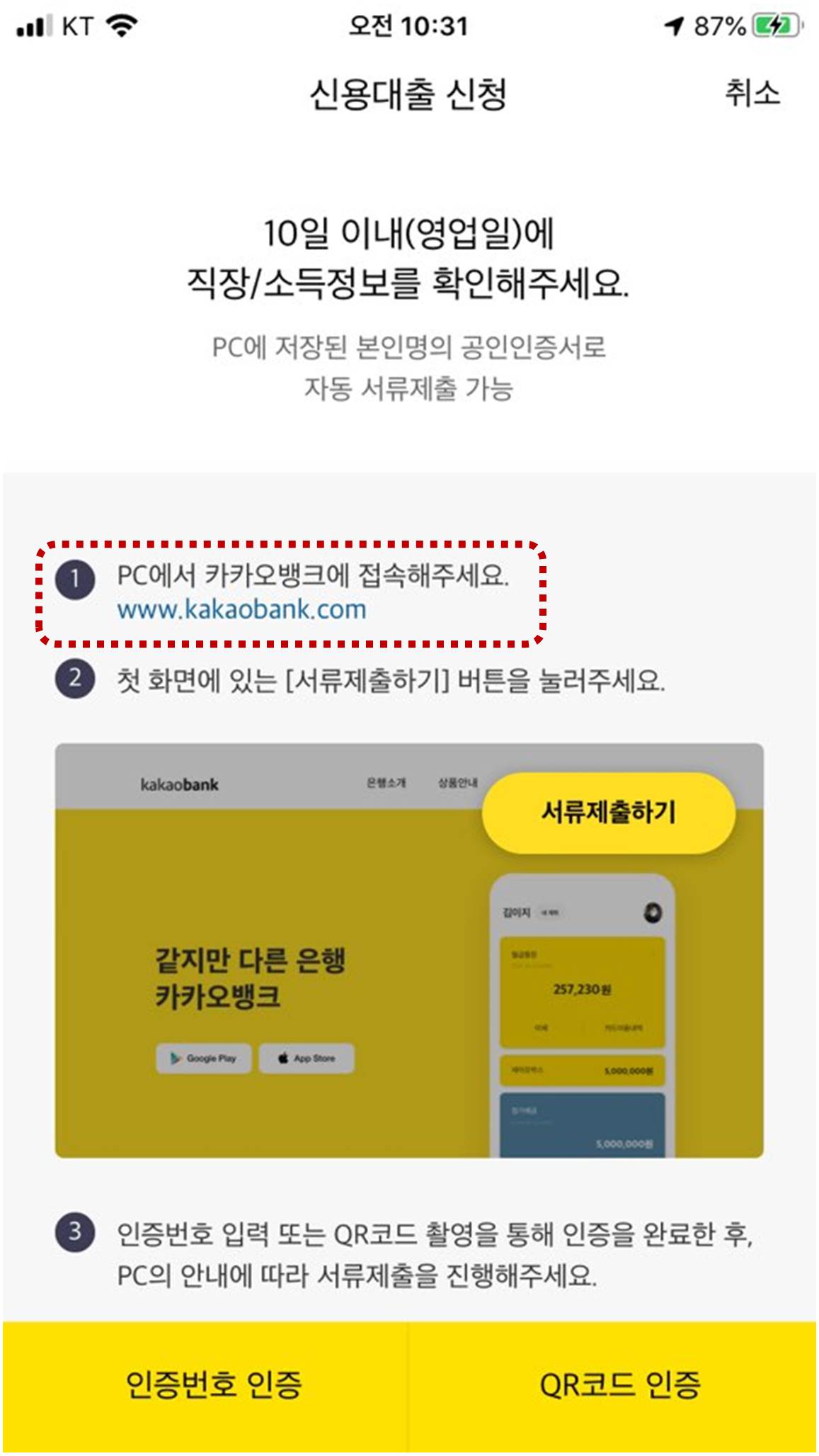 #11. PC에서 카카오뱅크 접속후 서류제출하기 클릭 후 로그인 클릭하면 QR코드와 인증번호가 화면이 띄워집니다.