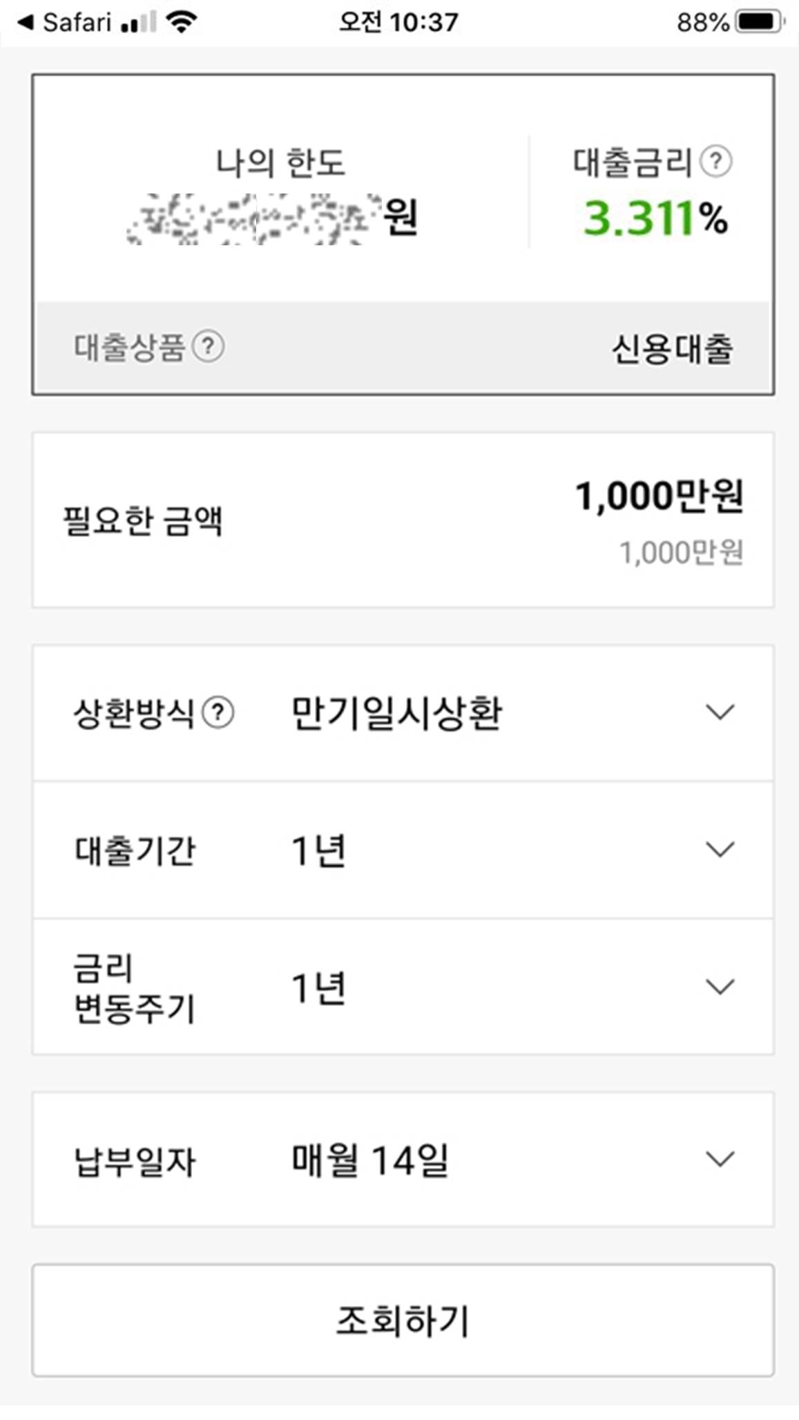 #16. 문제없이 진행이 되었으면 필요한 금액, 상환방식(원금 균등분할상환, 원리금 균등분할상환, 만기일시상환), 대출기간, 금리변동주기, 납부일자를 입력하고 "조회하기"을 클릭
