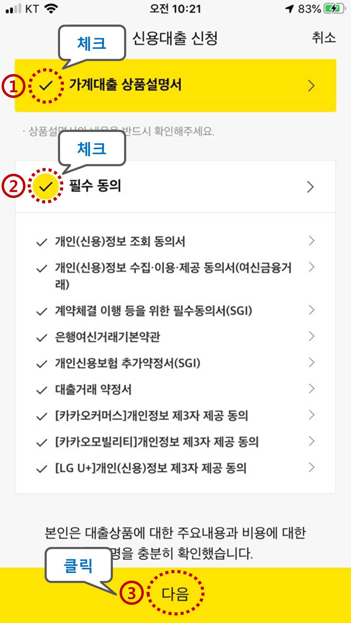 #5. 가계대출 상품설명서 "체크", 필수동의 "체크" (체크를 안하면 더이상 진행이 안됩니다.)