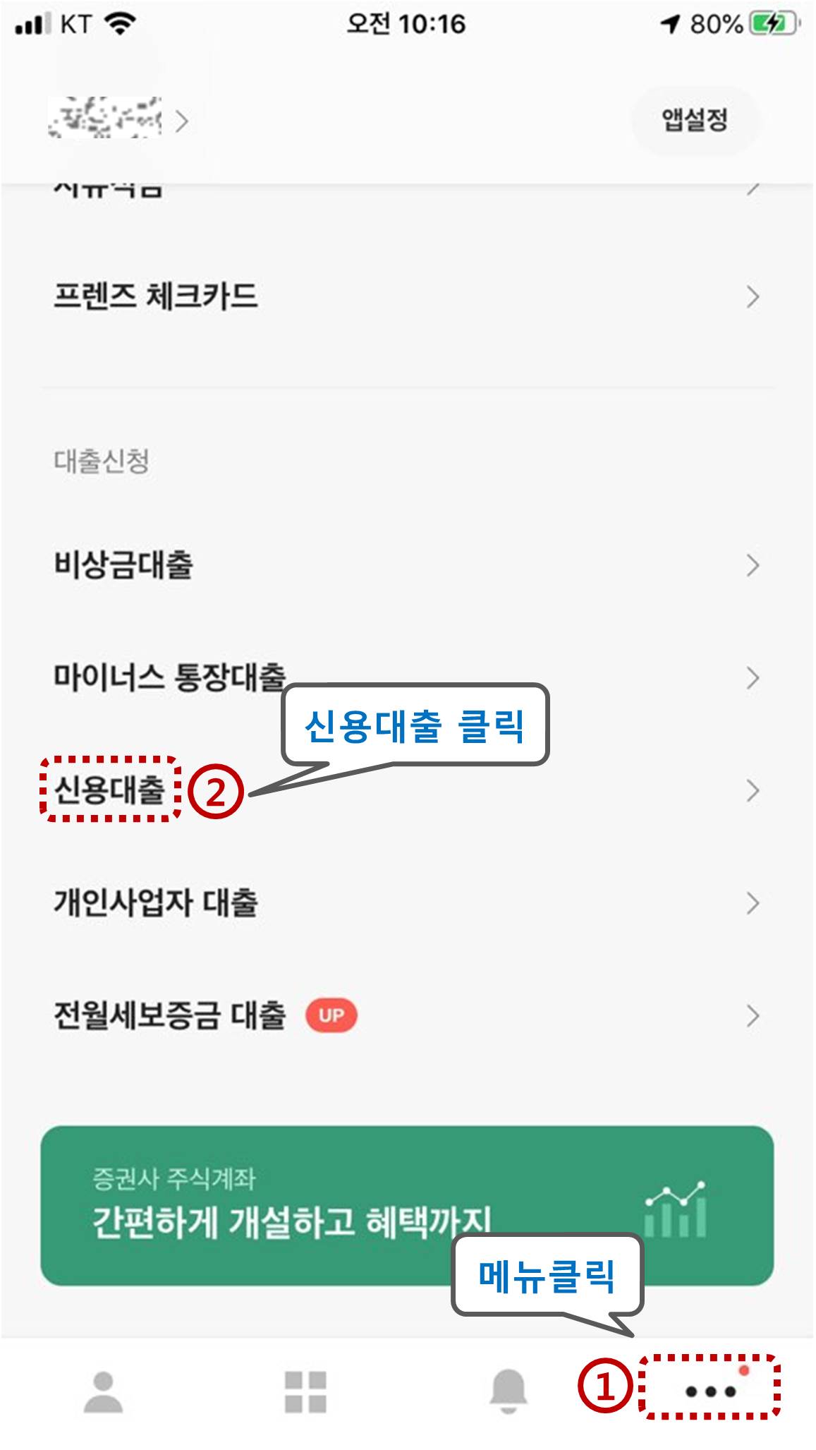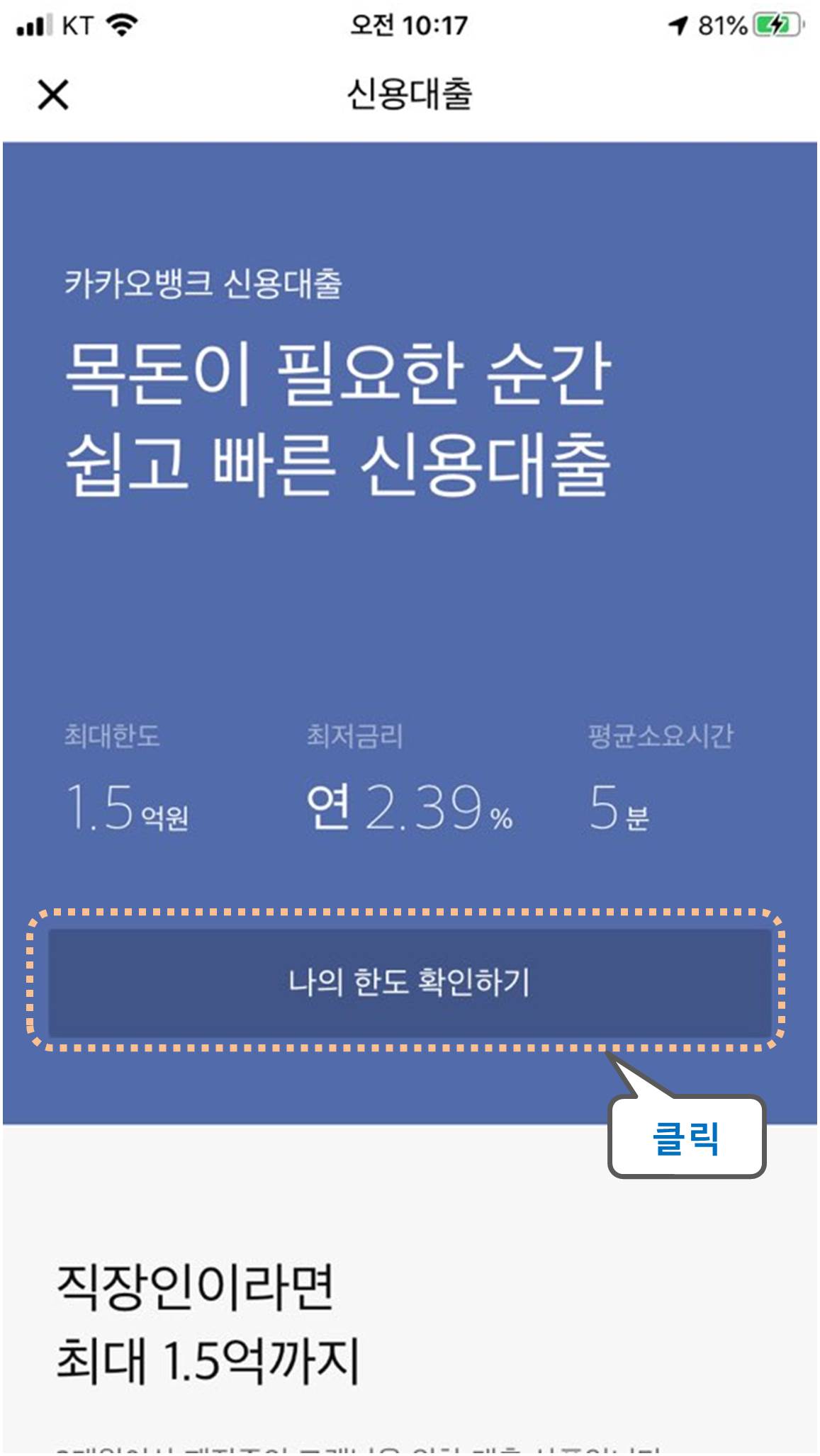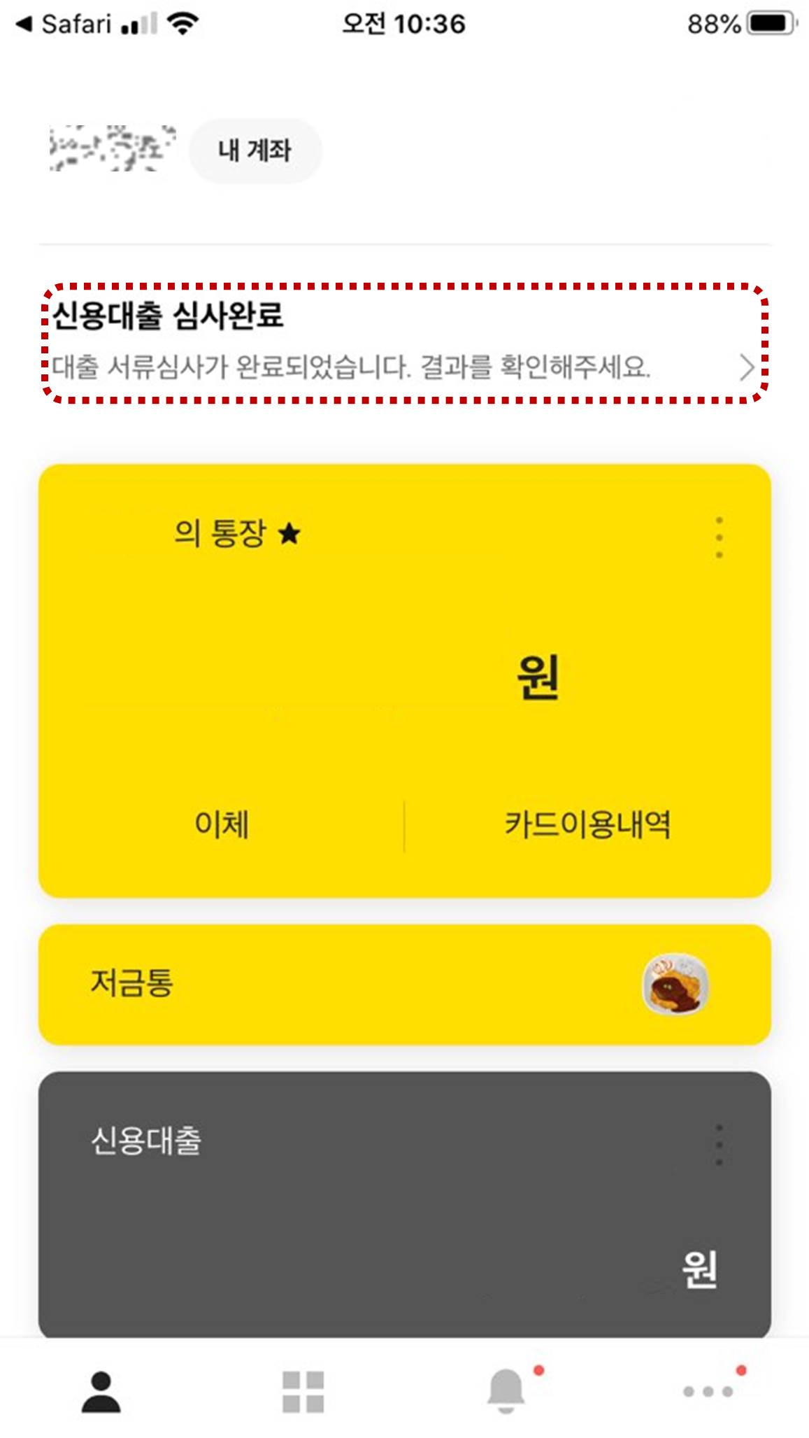 #15. 다시 핸드폰으로 돌아가서 카카오뱅크 메인화면에 보면 신용대출 심사완료라고 뜨고 클릭해서 들어간후 진행하기 눌러주면 됩니다.