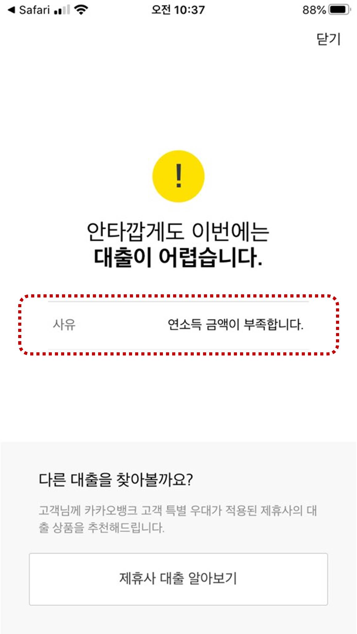 ※ 여기서 잠깐!! 아래와 같이 대출이 어렵다고 뜨면 메뉴의 고객센터에 들어가서 문의해 보시면 됩니다. 하지만 연소득 1,500만원 이상인데 사유에 연소득 금액이 부족하다고 뜬다면 재직중인 회사에서 4대보험이 미납되었을 경우 대출이 더이상 진행이 안됩니다.