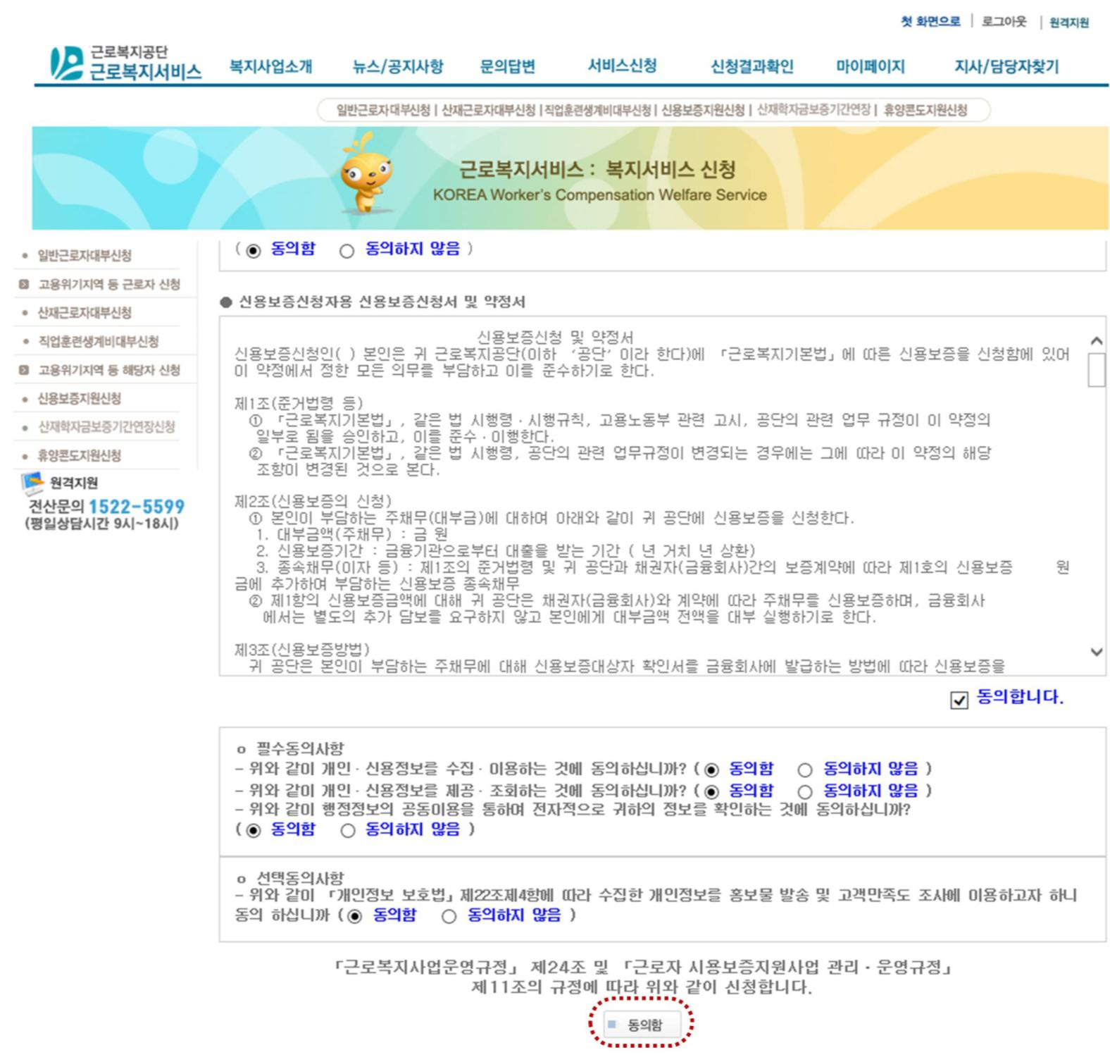 4. 일반근로자 대부신청 동의에서 해당 동의함에 모두 체크해주시고 밑에 동의함을 클릭합니다.