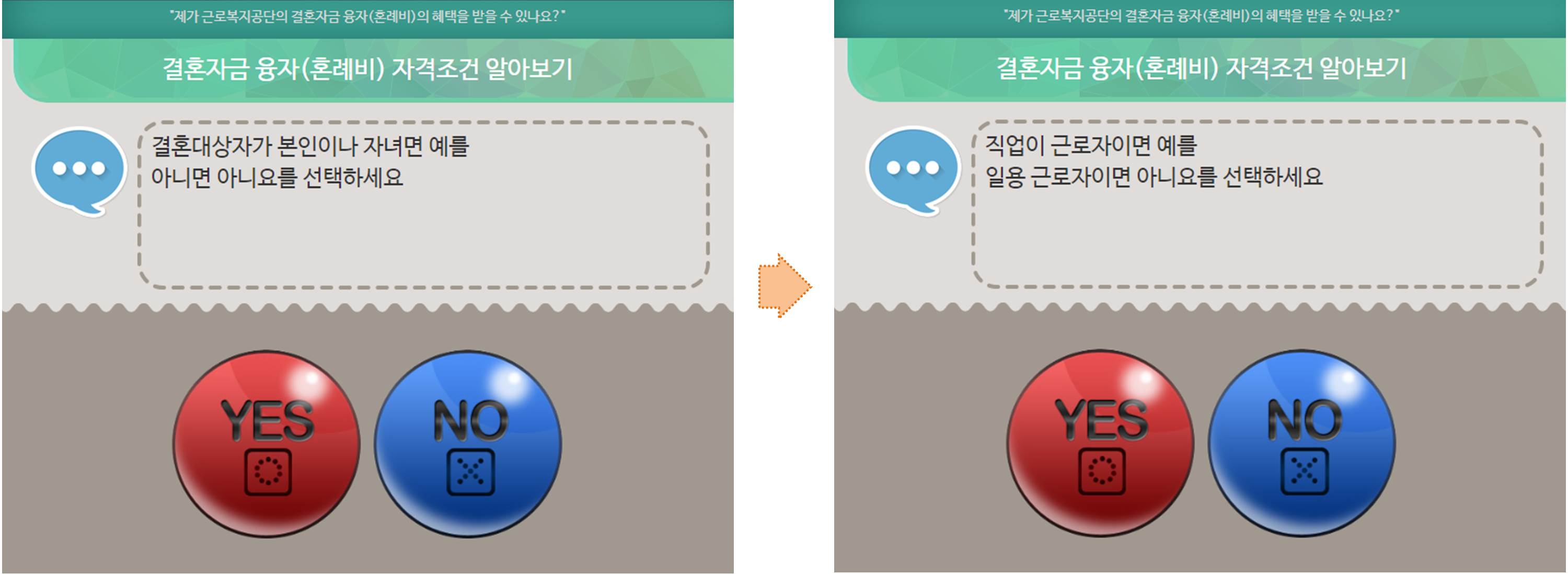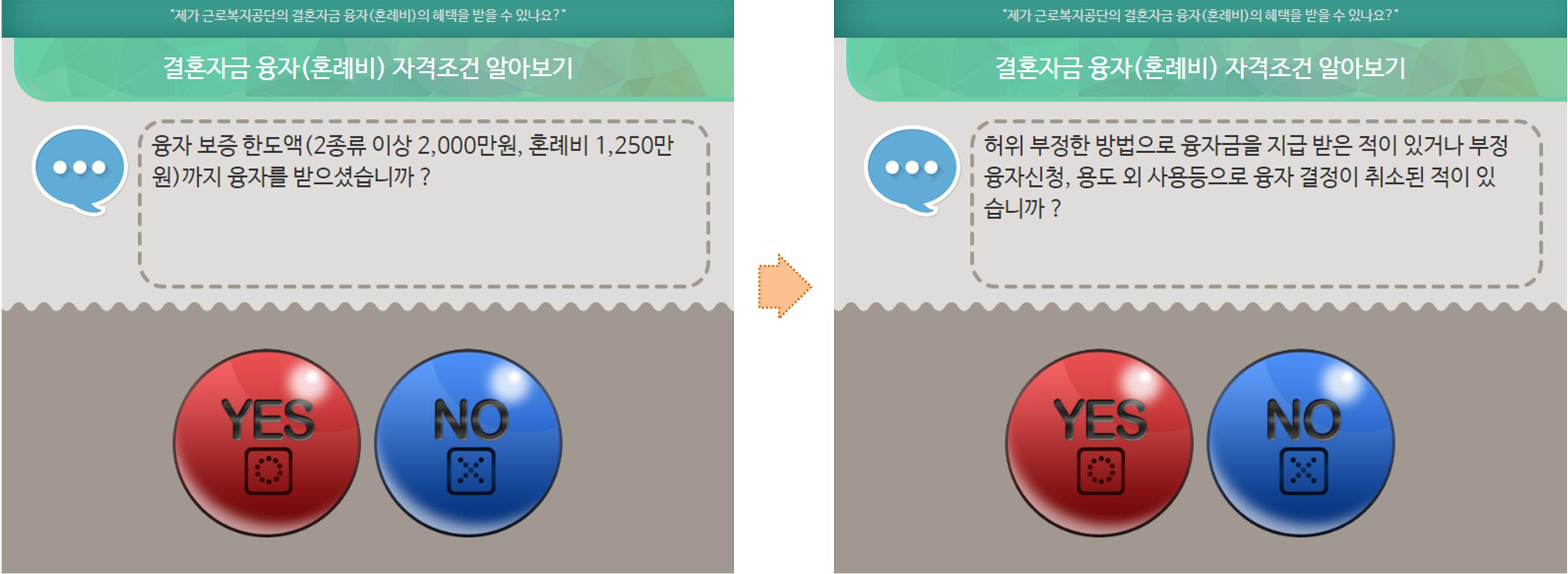 ※ 근로복지넷 사이트에서 나의 자격조건 알아보기를 누르면 아래와 같이 "YES" 또는 "NO"를 눌러 자격요건에 충족하는지 간편하게 알아보실 수 있습니다.