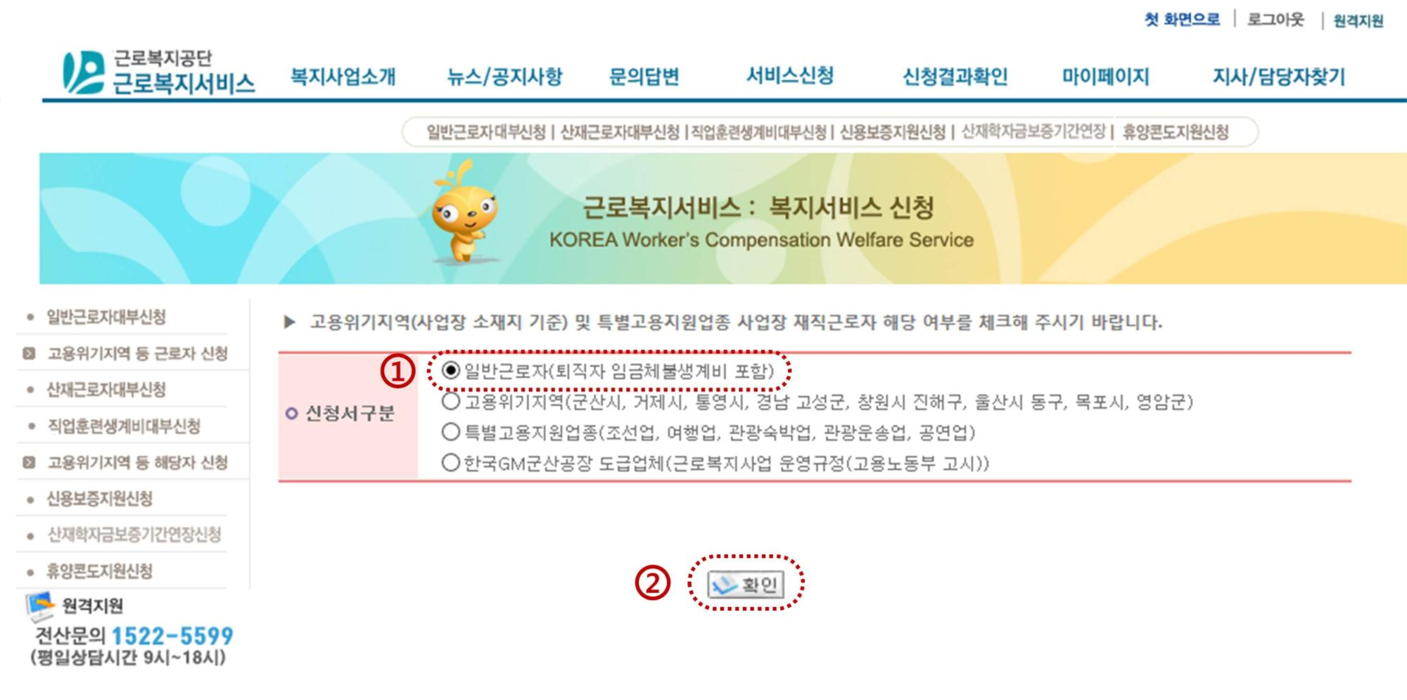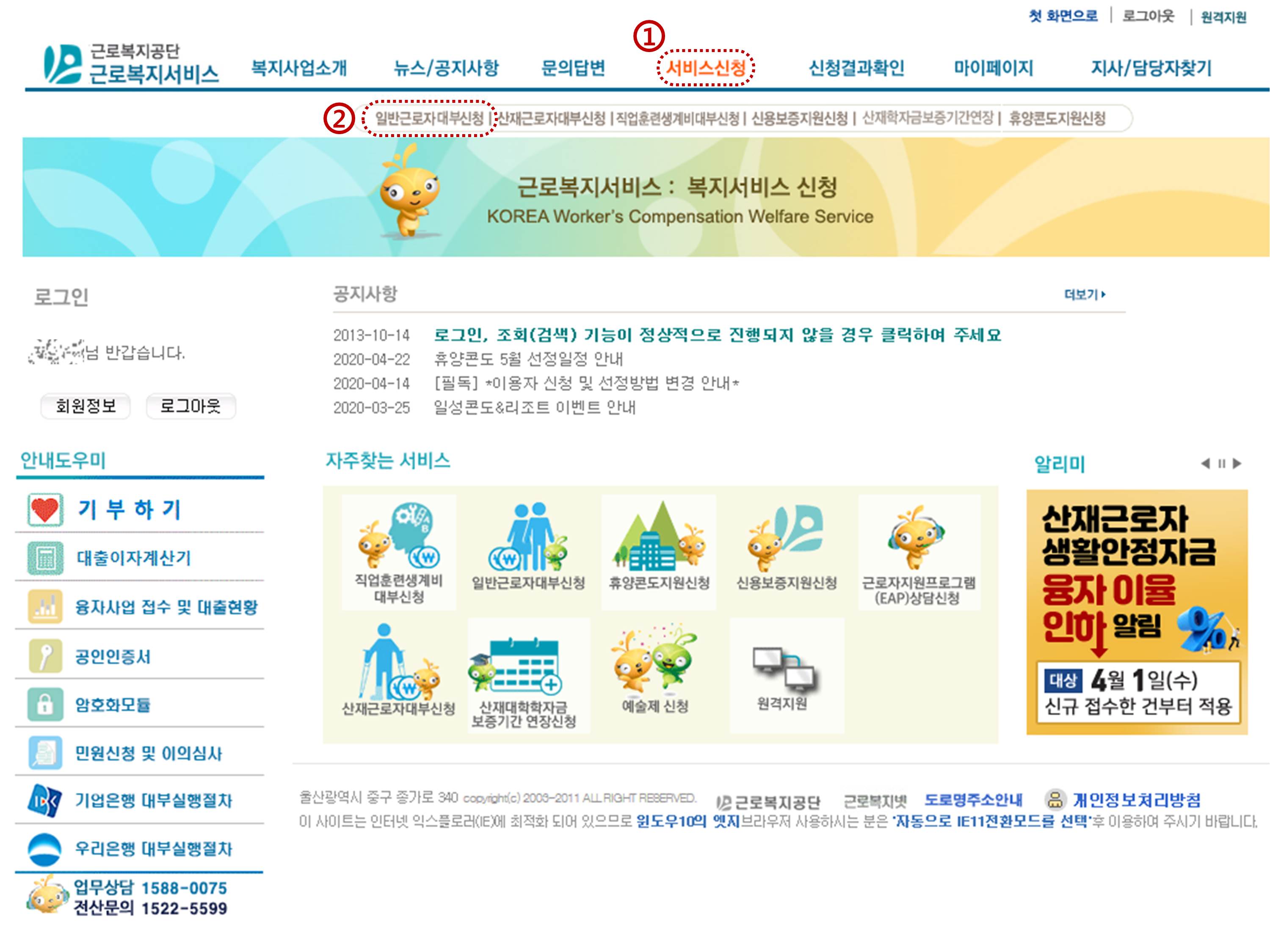 2. 상단의 메뉴에서 서비스신청 > 일반근로자대부신청을 클릭합니다.